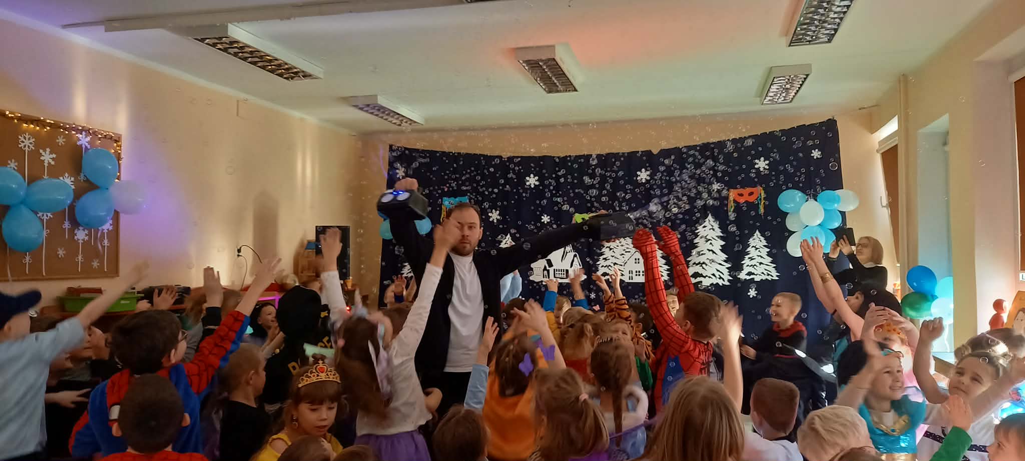 W przedszkolu odbył się wesoły bal karnawałowy,podczas którego dzieci w kolorowych przebraniach tańczyły,bawiły się przy muzyce i brały udział w zabawach.