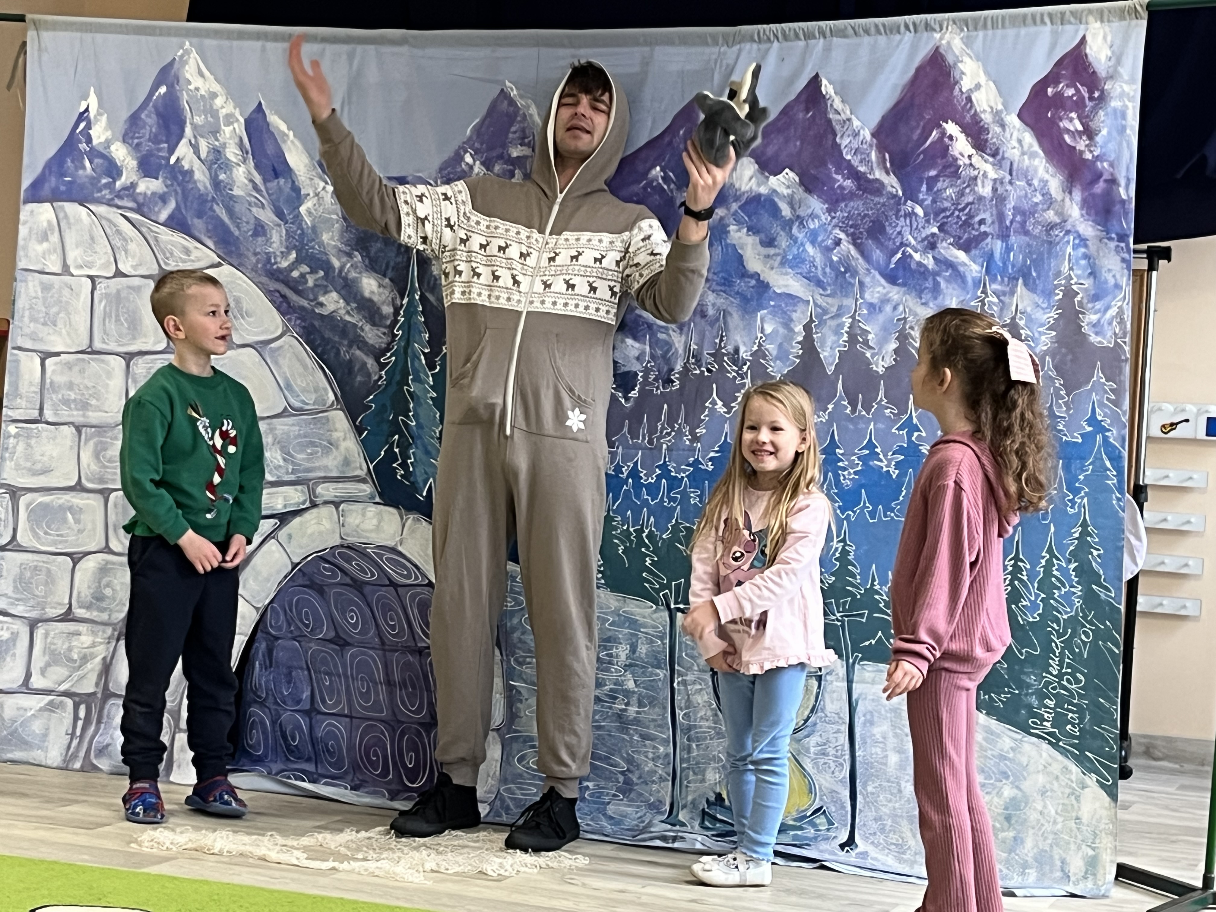 Teatr "Blaszany bębenek" - Mikołajkowe przedstawienie teatralne pt. "Anaruk w Grenlandii" - zapoznanie dzieci z życiem w surowym środowisku Grenlandii poprzez przedstawienie historii chłopca uczącego się samodzielności; nauka poprzez zabawę, pokazanie bohaterstwa i odwagi, a także rozwinięcie umiejętności przetrwania w trudnych warunkach; angażowanie dzieci w opowiadaną historię poprzez piosenki i zabawy.