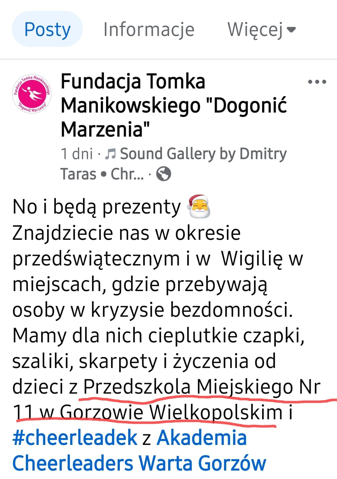 W tym roku dzieci przygotowały własnoręcznie kartki świąteczne dla seniorów mieszkających w Gorzowie Wielkopolskim. Działania prowadzone były w ramach akcji Fundacji Tomka Manikowskiego „Dogonić Marzenia”. Akcja przyniosła wiele radości starszym osobom, które często nie spodziewają się że ktoś o nich pamięta. Jest mostem łączącym pokolenia. Inicjatywa uczy dzieci szacunku wobec starszych osób, wrażliwości na drugiego człowieka.